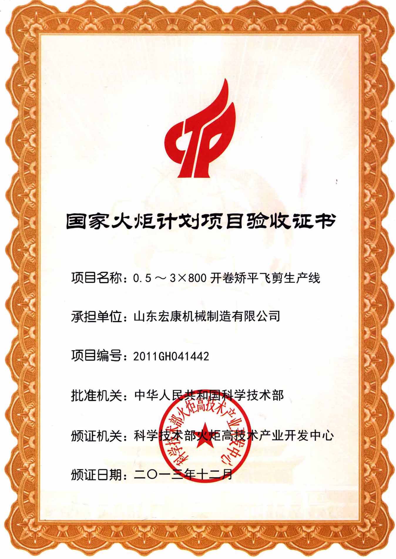 國(guó)家火炬計(jì)劃項(xiàng)目驗(yàn)收證書(shū)