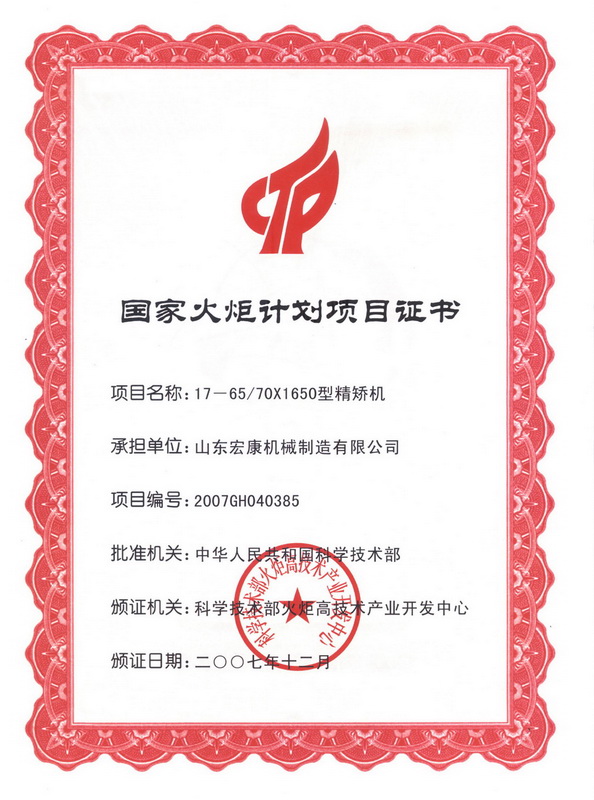 國(guó)家火炬計(jì)劃項(xiàng)目證書(shū)