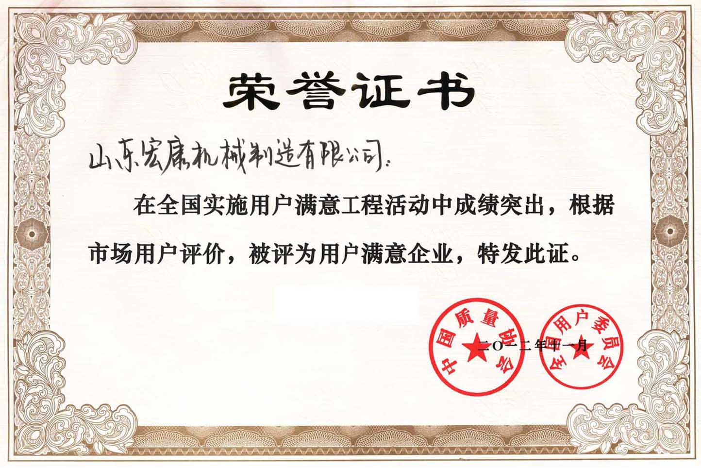 中國質(zhì)量協(xié)會(huì)榮譽(yù)證書